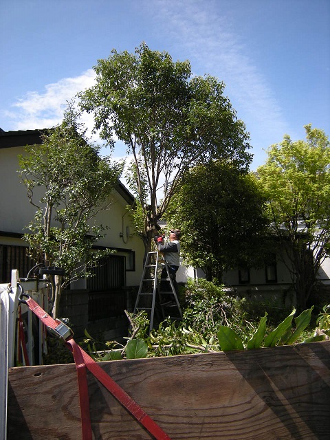 二連梯子と大脚立で伐採 6メートルほどある木を3メートルほどに伐採するお仕事を頂きました。 二連ハシゴと大脚立、そして、25cmチェンソーと45cmチェンソーで作業いたしました。 当該案件は処分不要でしたが、勿論、伐採樹木の持帰りも致しております。