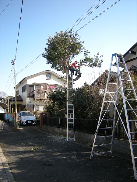 庭木伐採を承りました。 コロナ禍中、ありがたいご注文を頂きました。 デジカメ画像で見積り、翌日に2名で出張作業いたしました。 今回は2メートルほどの脚立で対応可能でしたが、7メートルまで伸びるハシゴの準備もしてあります。