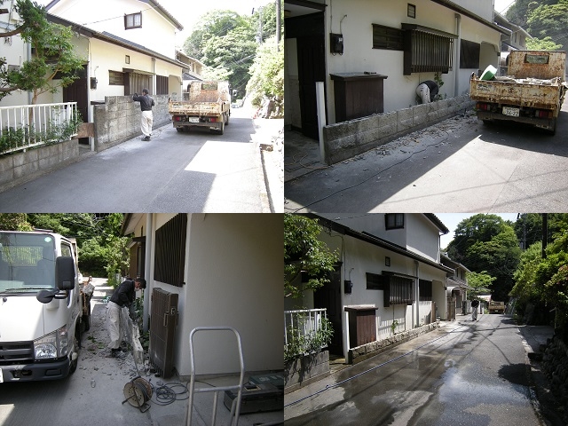 門柱の撤去 コンクリブロックに塗装をした玄関先門柱の解体撤去を承りました。 見積りは、事前にデジカメ画像をご提供頂けましたので、助かりました。 作業は、初めにグラインダーで境界塀との間に切込みを入れて、大金槌と電動ハンマーで砕きました。
