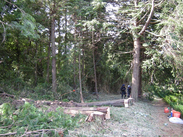 チルホールで伐採 ご覧いただくと、奥の1名がチルホール(ウィンチ)で切っている木を左側へ引っ張ているのをお分かりいただけます。 倒したい方向へ倒木させるための機材です。 一直線で引っ張ると、引っ張る人間にかぶさるように木が倒れますので、左のオレンジ色の滑車で角度を変えて逃げています。 難易度の高い伐採も我々にお任せください。